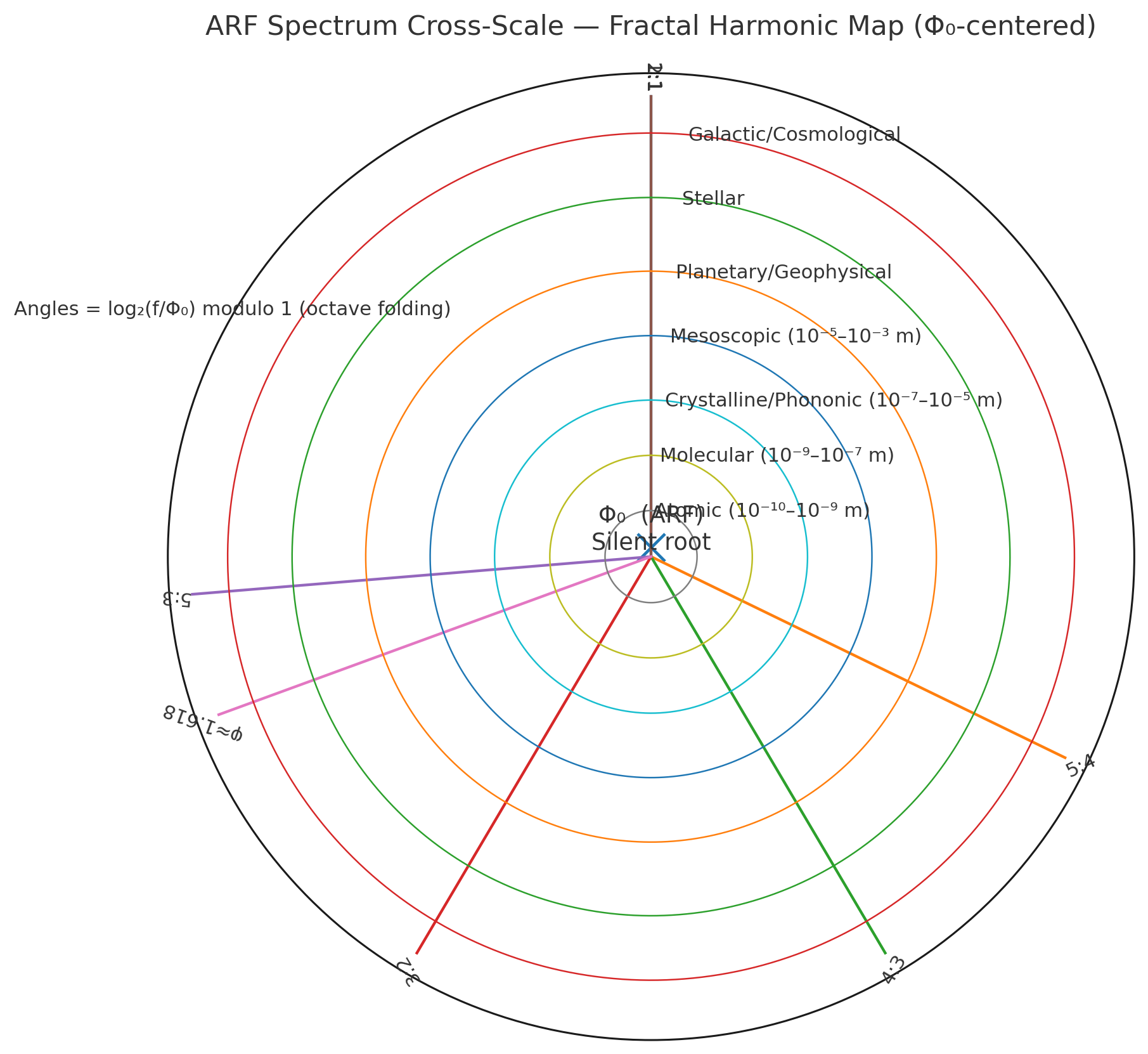 Fig.5: ARF Spectrum Cross-Scale — Fractal Harmonic Map (Φ₀-centered). A polar (octave-folded) map: angles encode log₂(f/Φ₀) modulo 1, so any frequency related by octaves collapses to the same spoke; Φ₀ sits at the center as the silent root. Concentric rings mark representative scale bands (atomic → galactic). Harmonic spokes (1:1, 5:4, 4:3, 3:2, 5:3, 2:1, and φ) show cross-scale alignment loci predicted by ARF coherence.