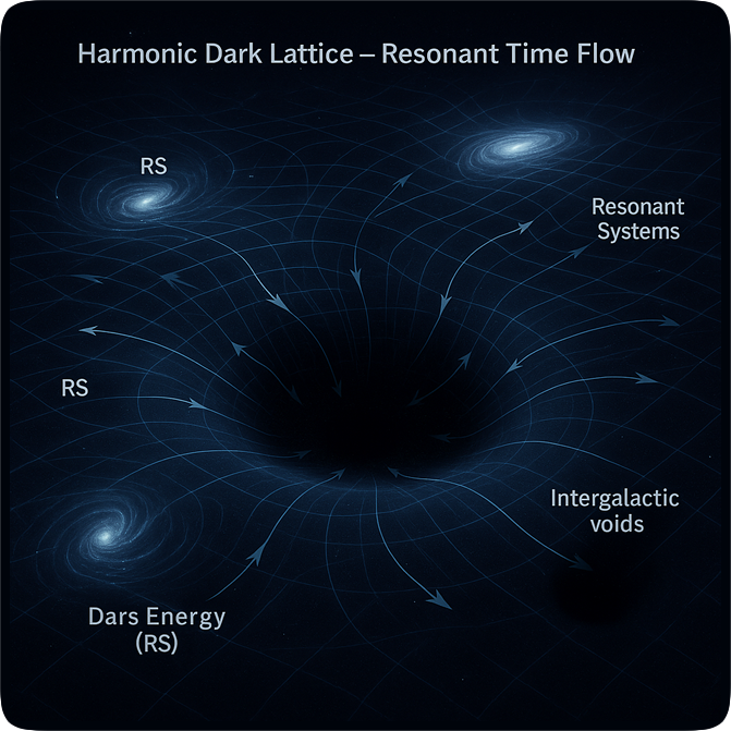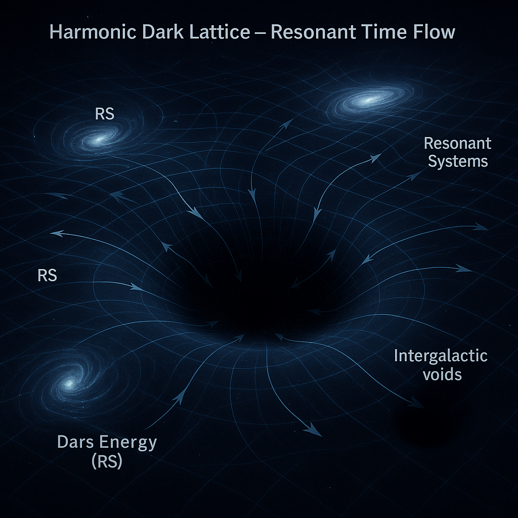 Fig.7: Introduces the Harmonic Dark Lattice, a direct visualization of DE currents as an invisible mesh. It shows DE flows as curved resonant vectors, intensifying near RS boundaries, GRF cavities, and intergalactic voids—forming the universal “hydraulic circuit” of resonance.