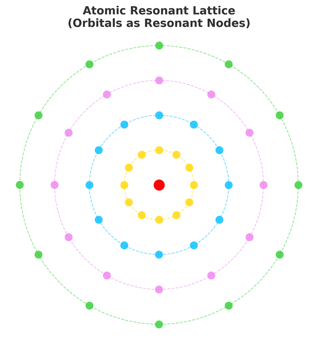 Fig.13:The Atomic Resonant Lattice illustrates orbitals not as probabilistic clouds, but as resonant nodes within a harmonic structure. Each orbital is represented as a node in a lattice of frequencies, highlighting the coherent vibrational identity of matter at its most fundamental scale.