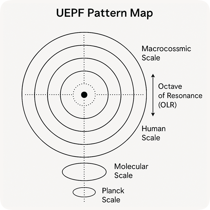 Fig.4:The UEPF Pattern Map visualizes the Universal Perceptive–Physical Scale as a nested fractal ladder of resonance. Each level represents a shift in perceptual and physical reference, guided by the Octave Law of Resonance (OLR). From subatomic vibrations to cosmic structures, the map highlights how harmonic scaling organizes reality across dimensions.